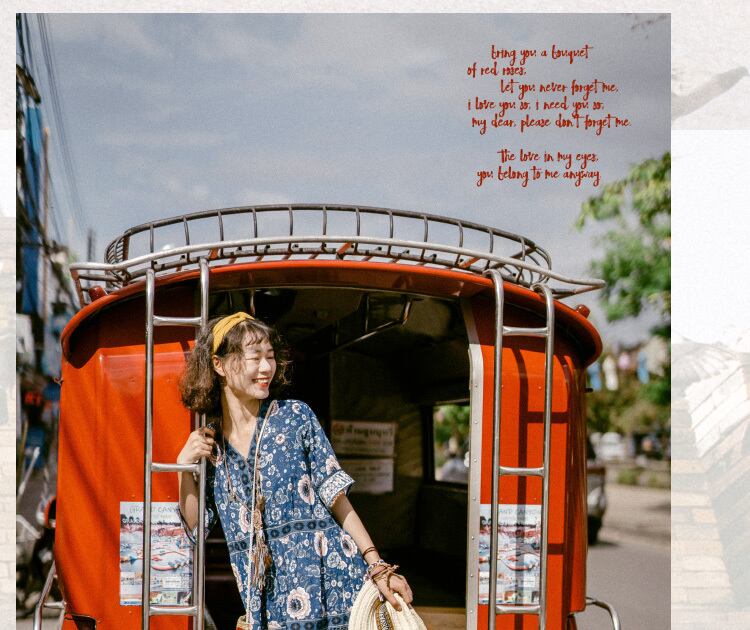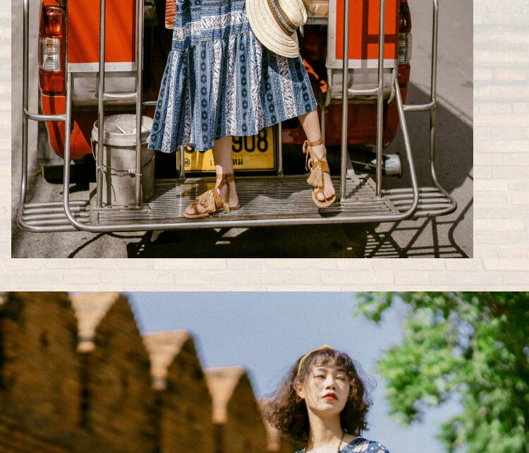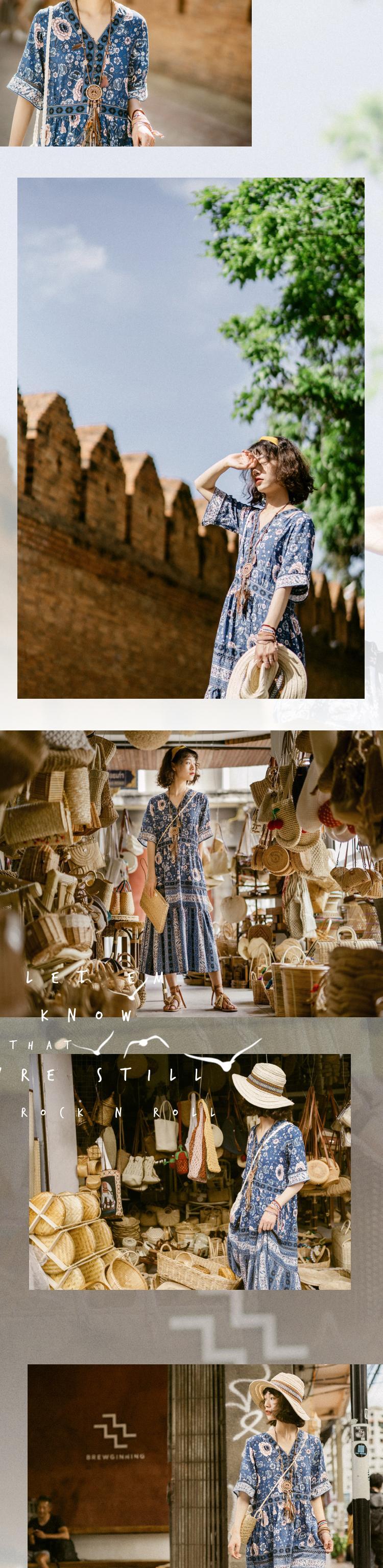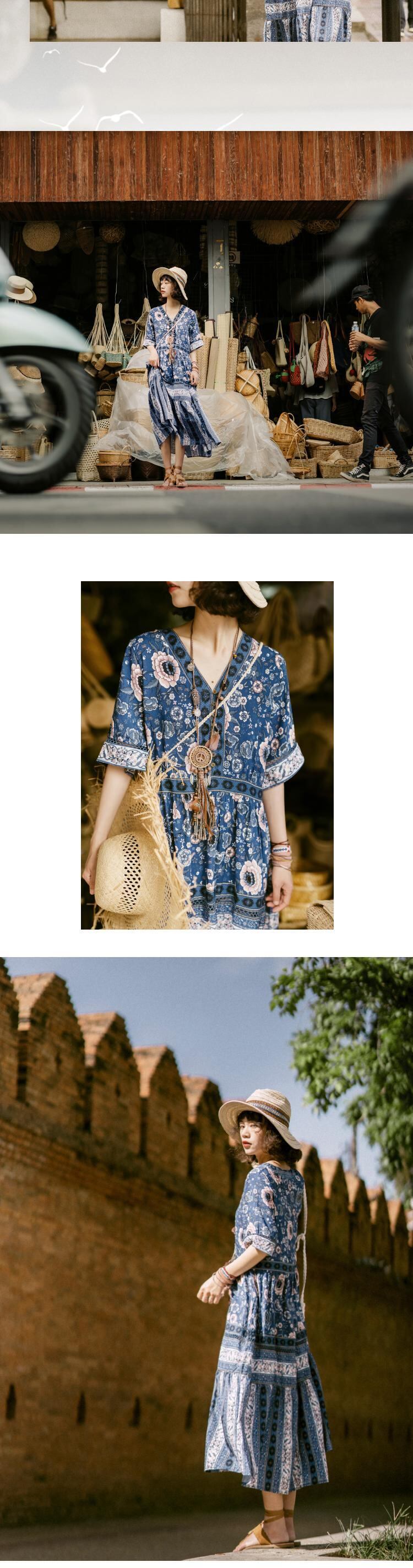 大きなスカートのボヘミアンエスニックブルーフローラルドレスを着てタイ旅行 ドリームホーストラベル婦人服68424483137