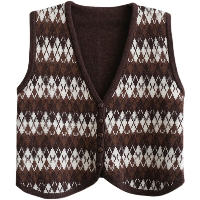 ドリームホースレトロニットセーターベスト女性Vネックシングルブレストオールマッチ菱形ジャカードチョッキウールベスト ドリームホーストラベル婦人服82093855952