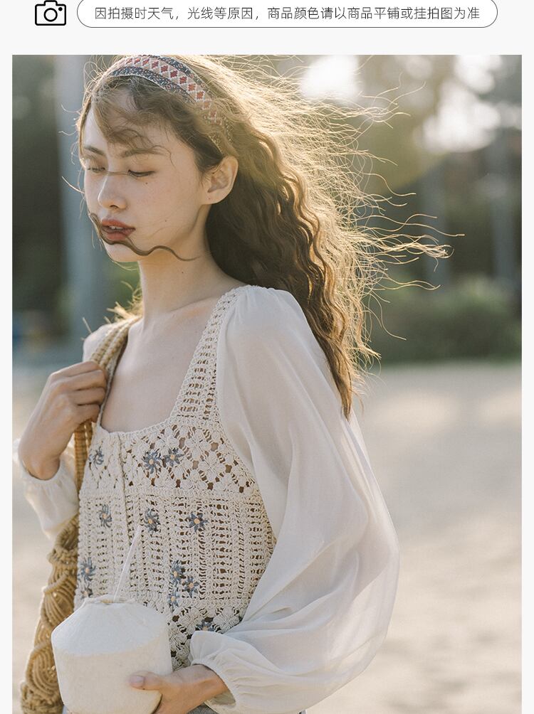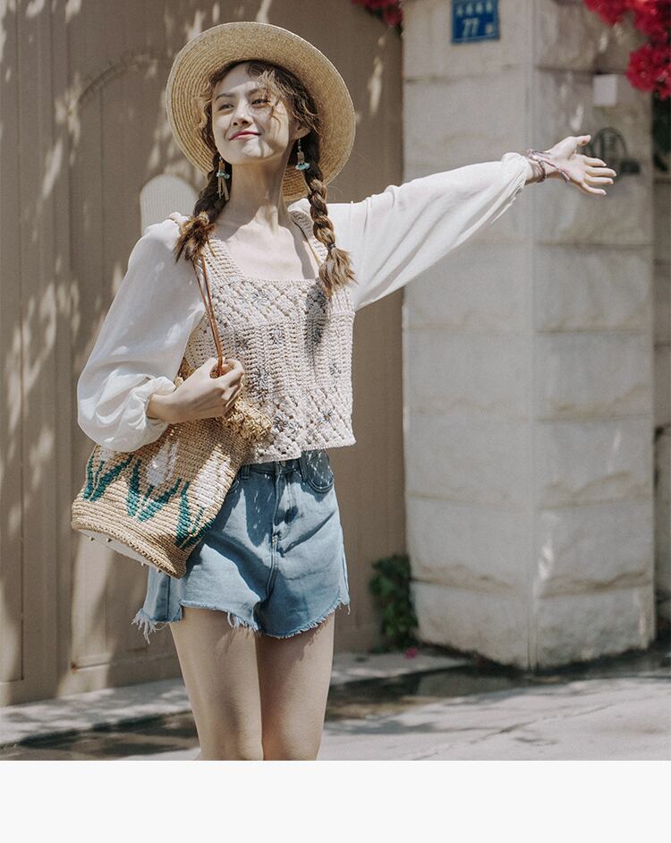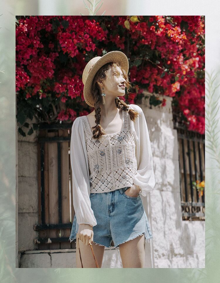 Flowerデザイン 刺繍ボヘミアンシフォンニットショートサマー ブラウス エレガント 夏物 ビーチ フラワーデザイン スクウェア ドリームホーストラベル婦人服65168591366
