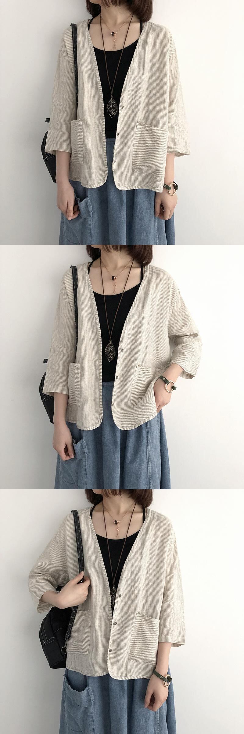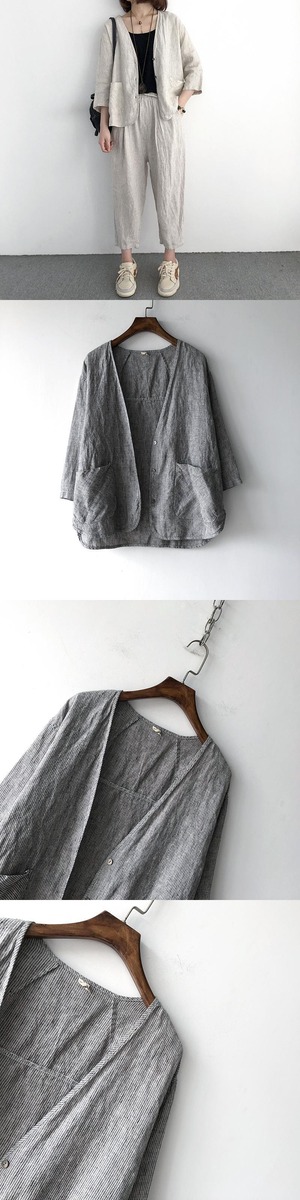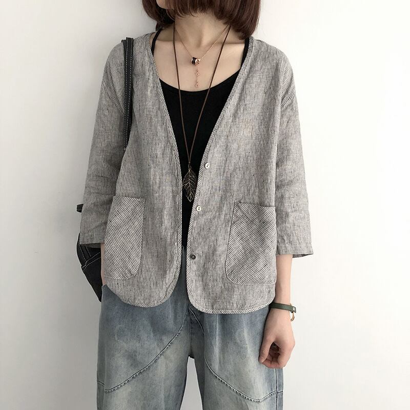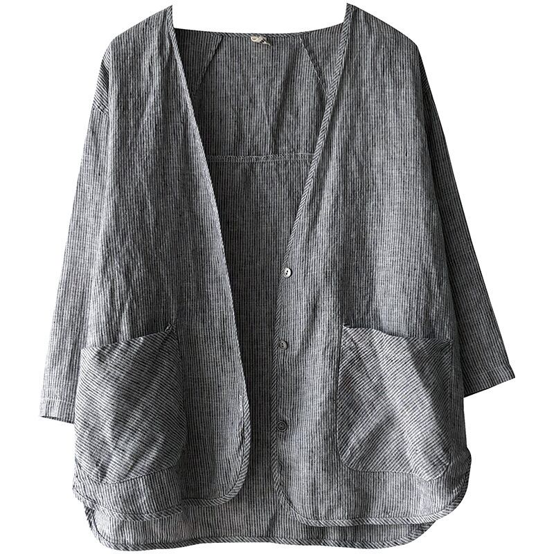 スプリングサマーストライプルーズ薄手Vネックカーディガンジャケット カジュアル 春物 夏物 Yiranxuaディースワード9490374374