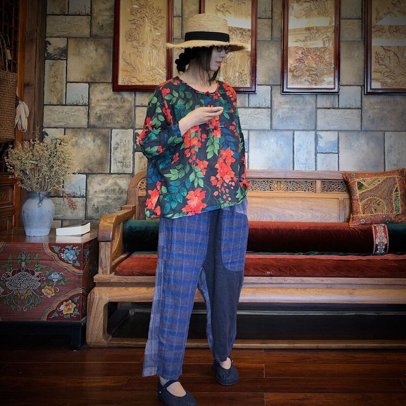 プリントバックルルーズシャツ グリーンレッド薄手 ピュア Yiranxuaディースワード44415418104