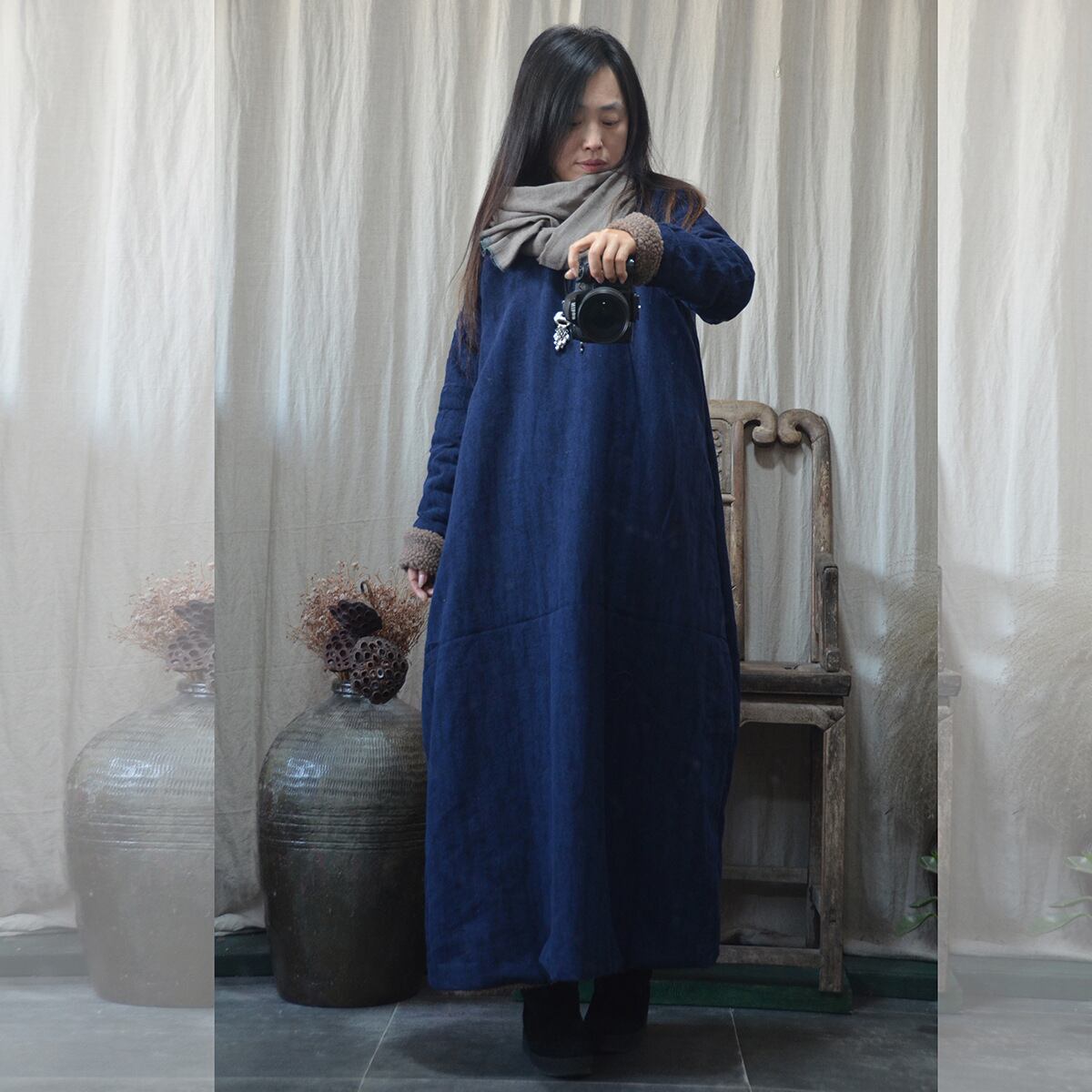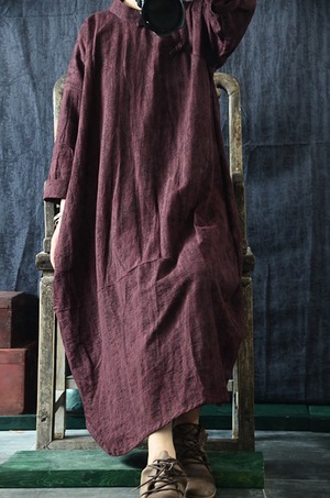 スタンダードスタイルバックルブレストガウンオータムウィンターワンピースドレス コットン レトロ 秋物 冬物 Yiranxuaディースワード88115036900