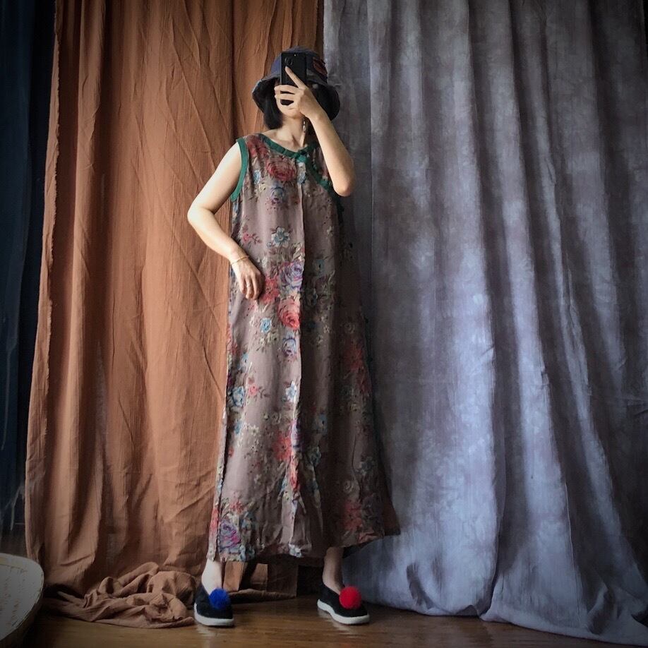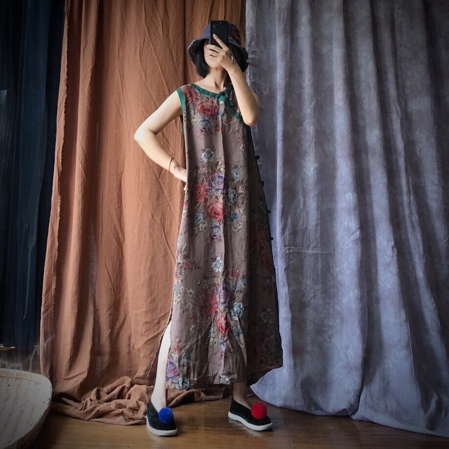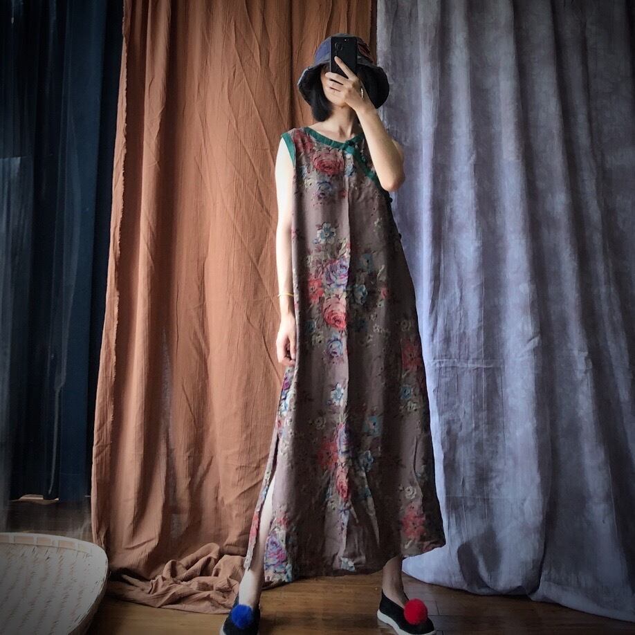 スタンダードスタイルスリムノースリーブボタンドレス カーキFlowerデザイン レトロ フラワーデザイン Yiranxuaディースワード11423553050