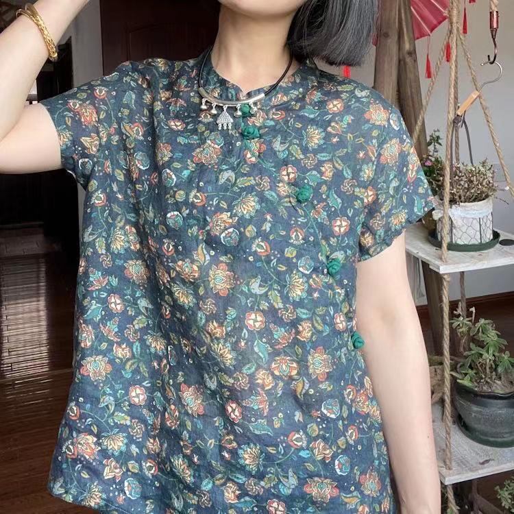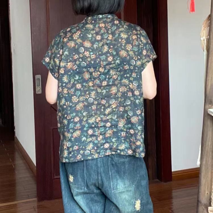 スタンダードスタンドカラーカラーボタンプリント柄半袖スリーブシャツ ショート レトロ ハーフスリーブ ピュア Yiranxuaディースワード93316089829