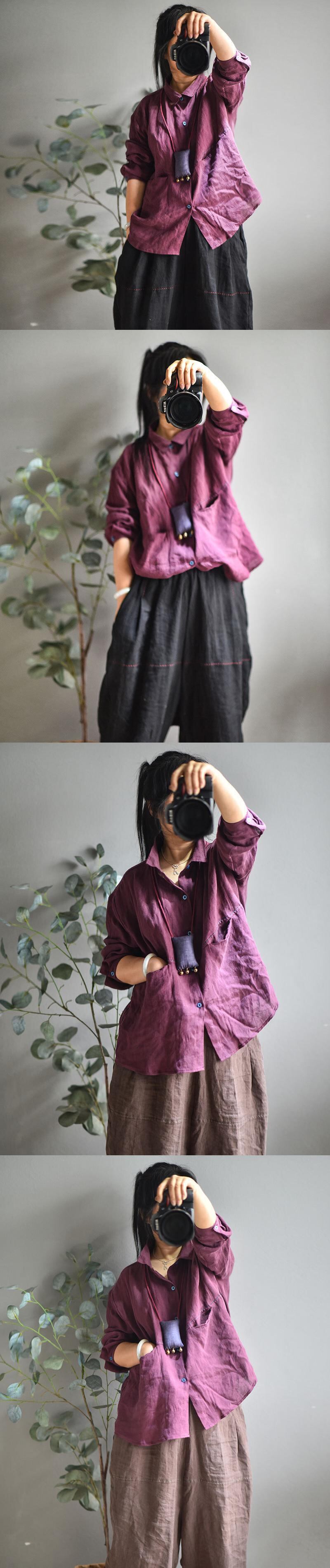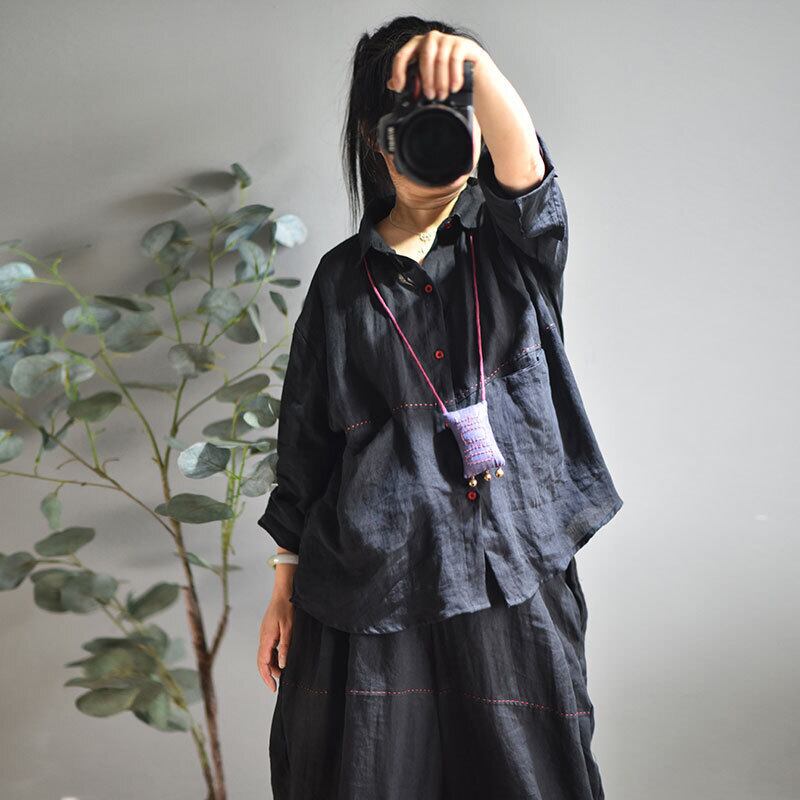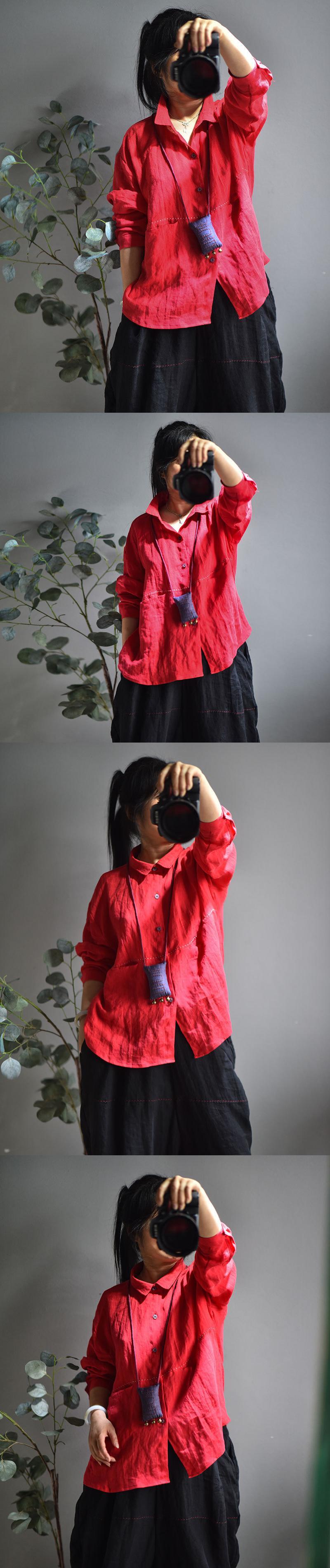 ラインシャツ ベーシックトップス レッド 刺繍 ステッチ Yiranxuaディースワード93882175054